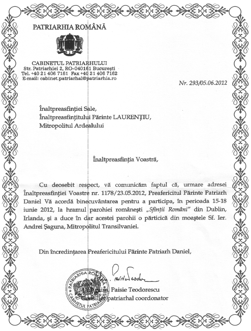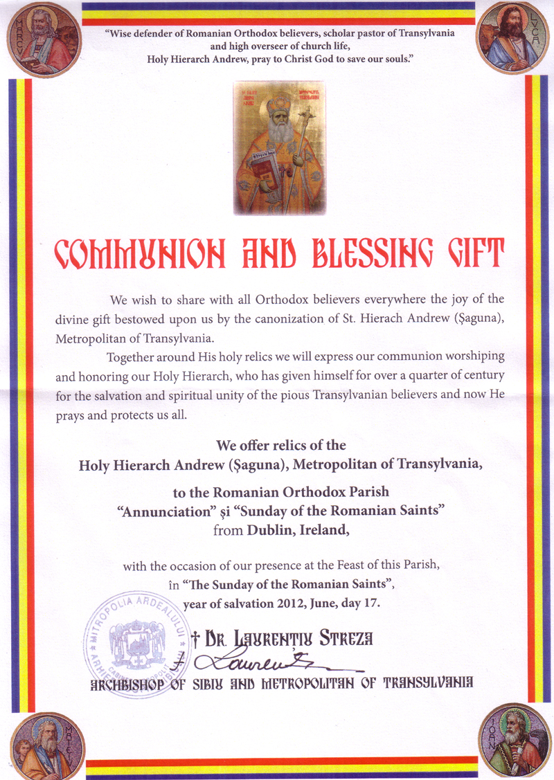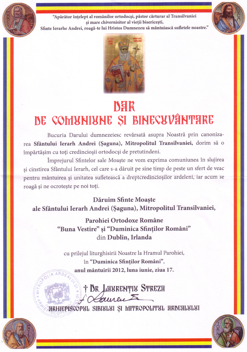 Paroh de cerere pentru primirea Sf. Moaşte ale Marelui Şaguna (.DOC)