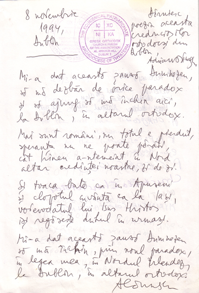 datata 8 noiembrie 1994 si aflata in manuscris in Carte de Aur a Bisericii Grecesti